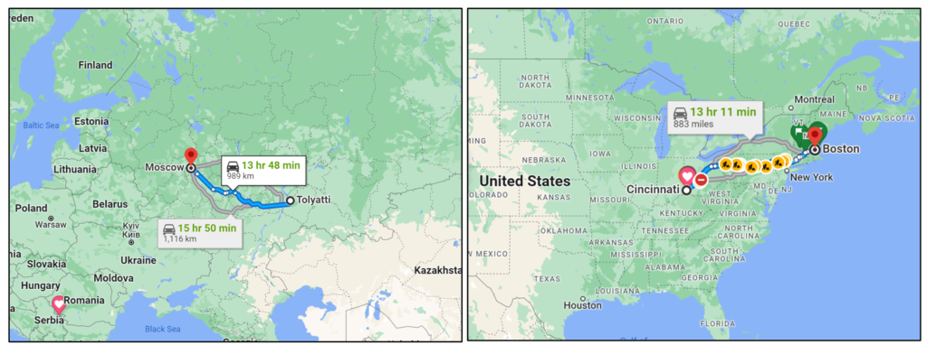 Алиса родилась и выросла в городе под названием Тольятти. Чтобы добраться на машине из Тольятти в Москву, нужно ехать 14 часов. Это далеко! Чтобы добраться на машине от города, где я выросла, Цинциннати, до города где я сейчась живу, Бостон, также нужно около 14 часов. Из-за этого расстояния, Алиса летает на самолёте когда она перемещается между этими двумя городами. Перелет из Тольятти в Москву обычно занимает около полутора часов. Она не часто летает в Тольятти к семье, но её мать один или два раза в месяц летает в Москву. Она косметолог и у неё несколько клиентов в Москве.